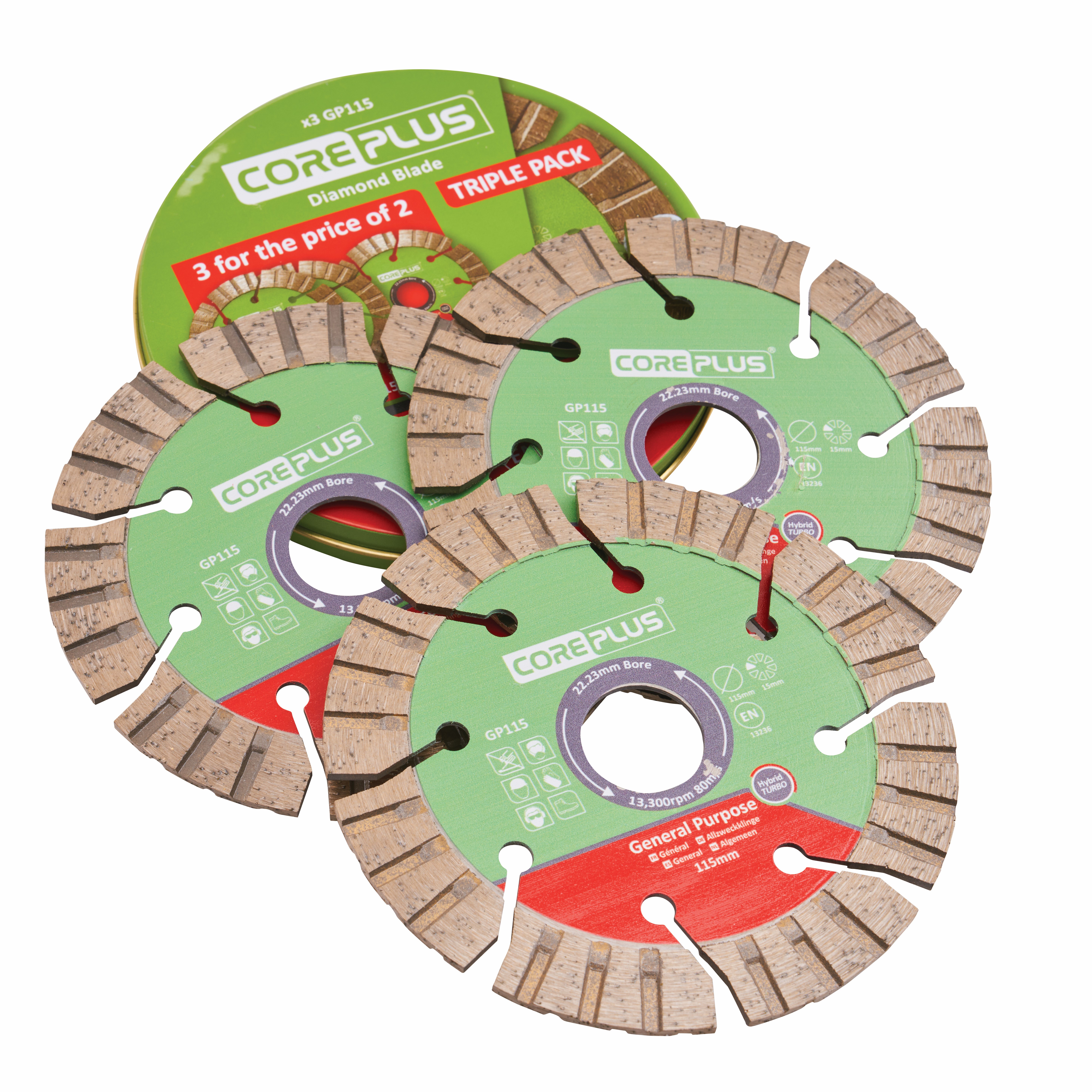This XMS General Purpose Diamond Blade - 115mm Triple Pack, produced by CorePlus, utilises hybrid turbo technology (HTT), interspersed turbo segments provide the optimum balance between long life and fluid speed, a perfect Get Kitted Out idea. It has a precision-engineered, high-grade steel tensioned core for a blade which spins true. A high concentration of premium-grade diamond per segment and a bonded cutting edge help to prevent the diamond from getting glazed over in use.