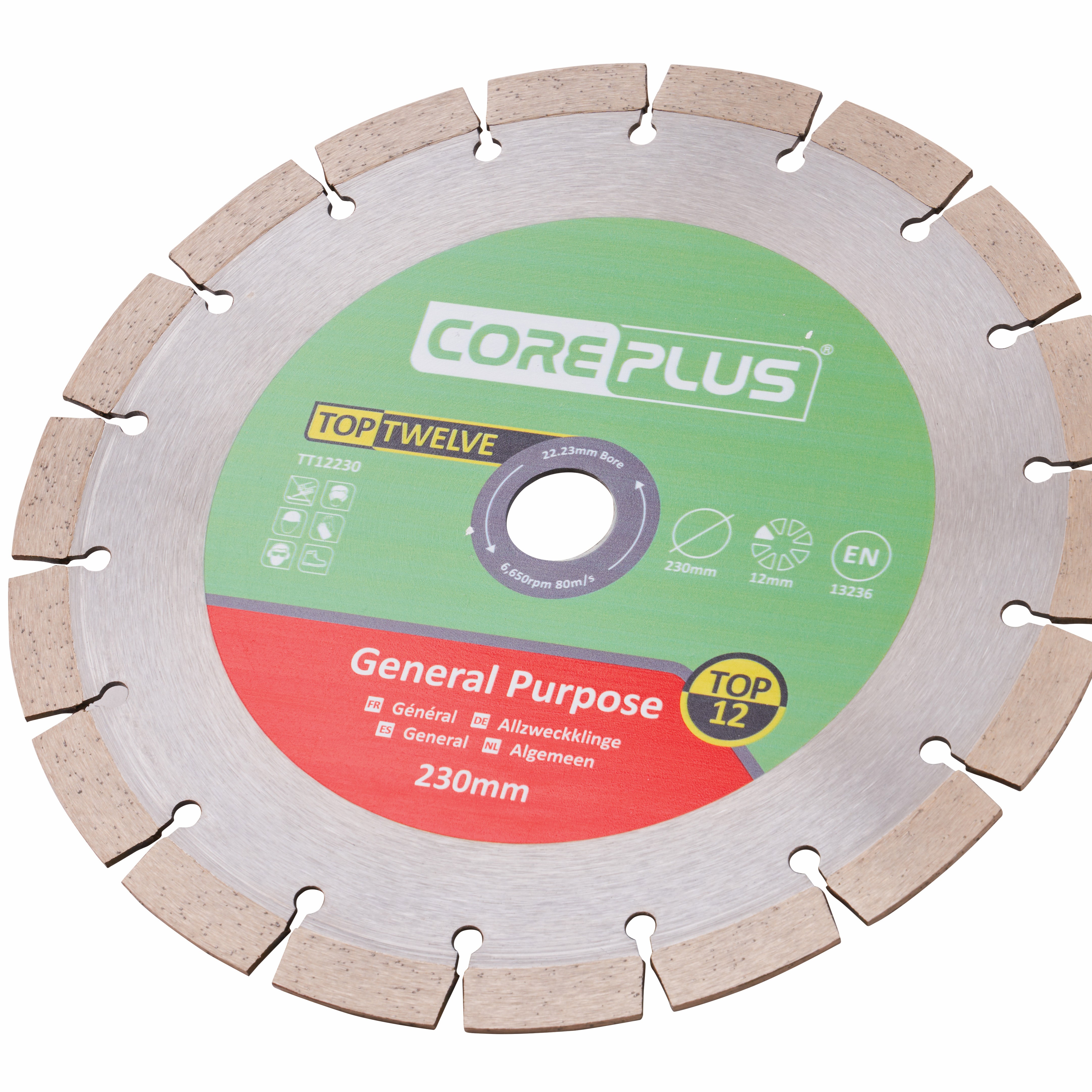"These XMS Top Twelve General Purpose Cutting Blades made by CorePlus are designed to provide low-cost cutting in various building materials. This twin pack includes two 230mm blades, each featuring premium-graded diamond segments and a tensioned high-grade steel core manufactured to EN 13236 quality standards. These blades are suitable for cutting concrete, concrete lintels, reinforced concrete lintels, hard sandstone, concrete pipes, concrete paving slabs, bricks, block paving slabs, concrete kerbs, clay pipes, hard slate, roofing tiles, quarry tiles, and more. The 12mm segments ensure efficient cutting performance, while the high concentration of premium grade diamond in each segment guarantees superior cutting ability. The high-grade steel core is precision-engineered and tensioned for stability and durability. The advanced bond metallurgy also prevents glazing, ensuring a clean cut every time. The CorePlus Top Twelve 230mm Twin Pack is the perfect choice for professionals and DIY enthusiasts alike. It offers reliable performance and durability for all your cutting needs, a must Get Kitted Out quality option."