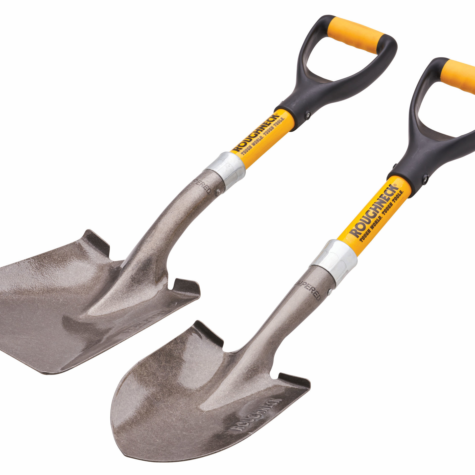 "The New & Exclusive XMS Bulk & Round Micro Shovel Twin Pack is ideal for working in confined spaces and for shoveling material from bulk bags of aggregate, etc. They each have full sized, soft grip handle, they also have heavy duty, heat treated blades with foot tread, a GKO winter must have."