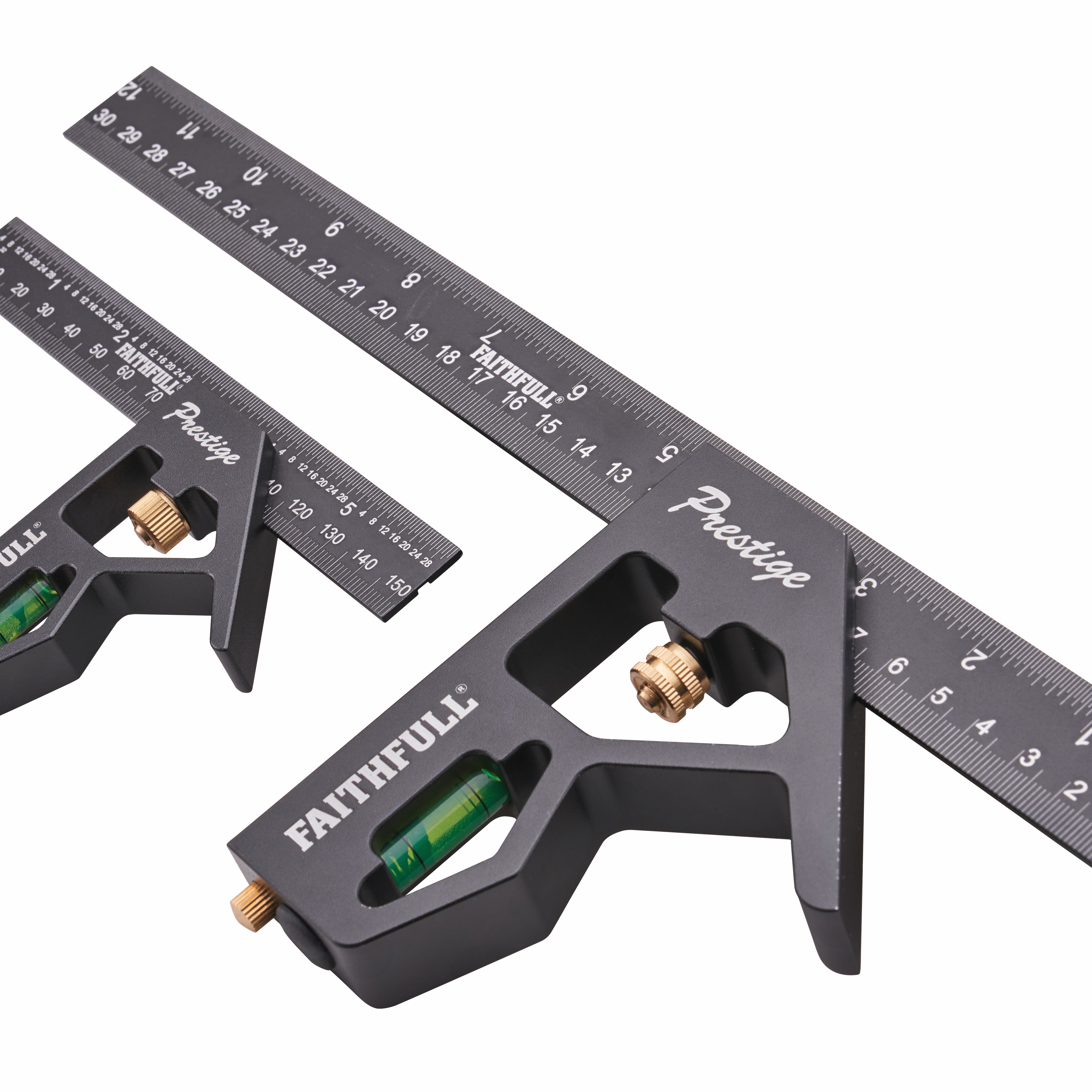 This XMS Prestige Combination Square Twin Pack from Faithfull is manufactured from aluminium using computer numerical controlled (CNC) machines. The black anodised finish offers enhanced corrosion protection and the laser-etched scales give outstanding measurement accuracy.